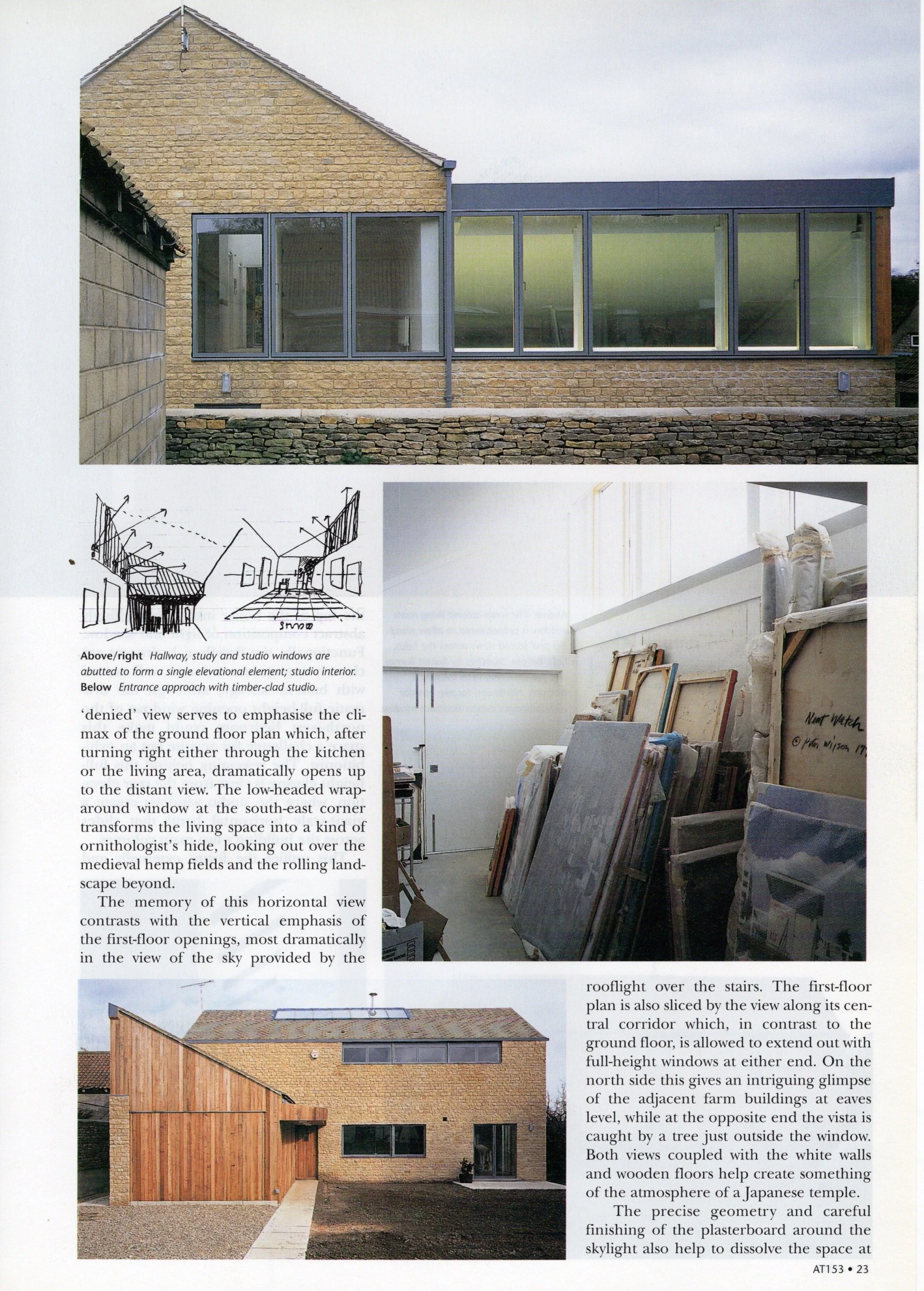 The design incorporates an artist’s studio, large library and writing room. The building is sited close to the northern and adjacent field boundary, the L-shaped plan enclosing a south facing garden which also functions as an entrance courtyard.