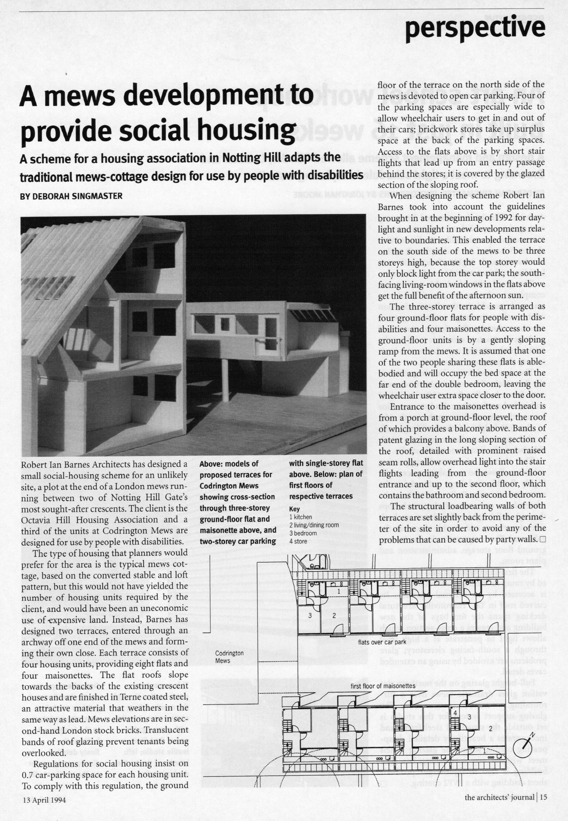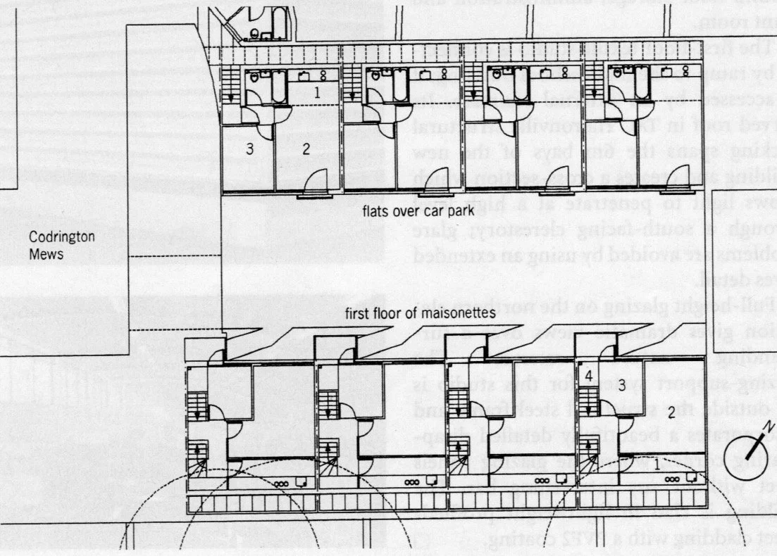 A social Housing scheme in Notting Hill Gate for a local housing association, containing 8 No 2 person flats and 4no 4 person maisonettes, with on site car parking for 7 cars. Designed to resemble the traditional mews housing prevalent in the area. The terne coats stainless steel roofs with Okalux roof glazing are profiled to conform to the day lighting requirements of the neighbouring houses, onto which the mews backs. The three and two storey scheme accommodates disabled wheelchair access provision for the ground floor units on the south side. Ground level porches provide balconies for the upper maisonettes.